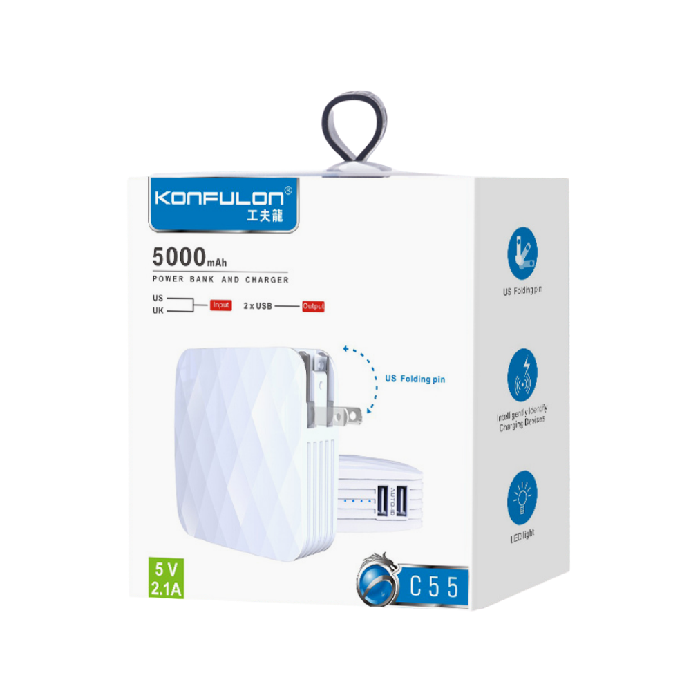 Konfulon C55 5000 mAh Powerbank’li Şarj cihazı, maksimum 2.1A çıkışı ile yüksek hızlı şarj sağlayan ve mobil cihazlarınızı en yoğun günlerinizde destekleyen, aynı anda iki cihazı bağlayabileceğiniz hem taşınabilir hem de duvar tipi şarj cihazıdır.